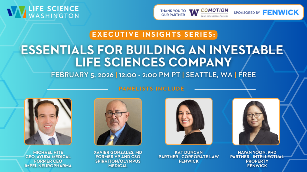 Executive Insights is designed to be a powerful networking opportunity. This series offers direct access to Washington’s most influential life science leaders and blends relationship-building opportunities with actionable insight related to focus areas such as early-stage fundamentals, financial and cap table strategies, and effective negotiations. Each session is crafted to spark meaningful connections and practical takeaways, so attendees can register for as many sessions as they wish, with capacity varying by topic and location.